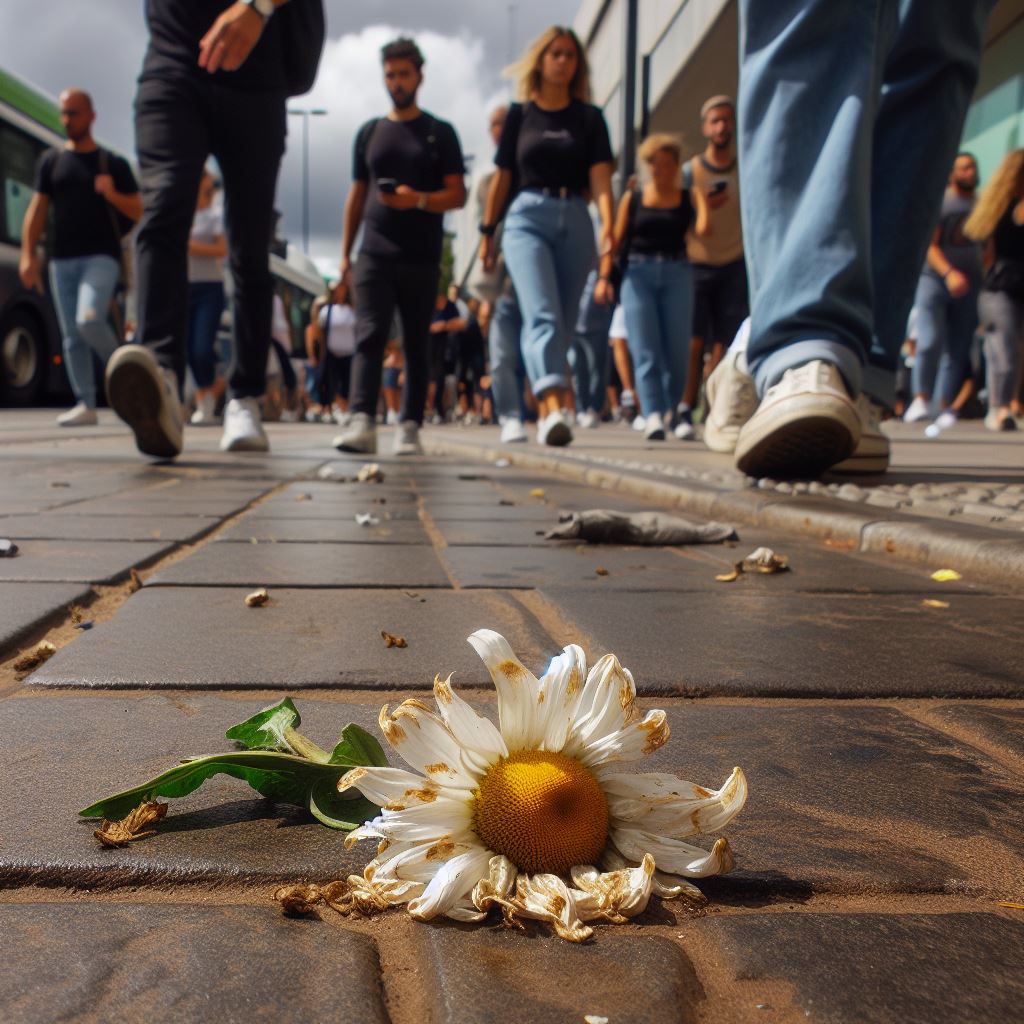 Fiquei pensando essas coisas enquanto eu andava pelas ruas do Centro. Eu andava cabisbaixo e vi uma margaridinha branca sem caule jogada no chão já murcha e pisoteada. Como essa flor veio parar aqui? Como se perdeu? Caiu de um buquê? Se desprendeu do cabelo de alguma moça elegante que passou hoje por aqui? Parei um pouquinho como se eu tivesse em frente a um esquife. O esquife de Clarinha. A mulher sem parente reverberando em minha mente. Maldita hora que fui ler a notícia! A flor! Uma margarida tão clara e pura quanto Clarinha… Esta flor é Clarinha…